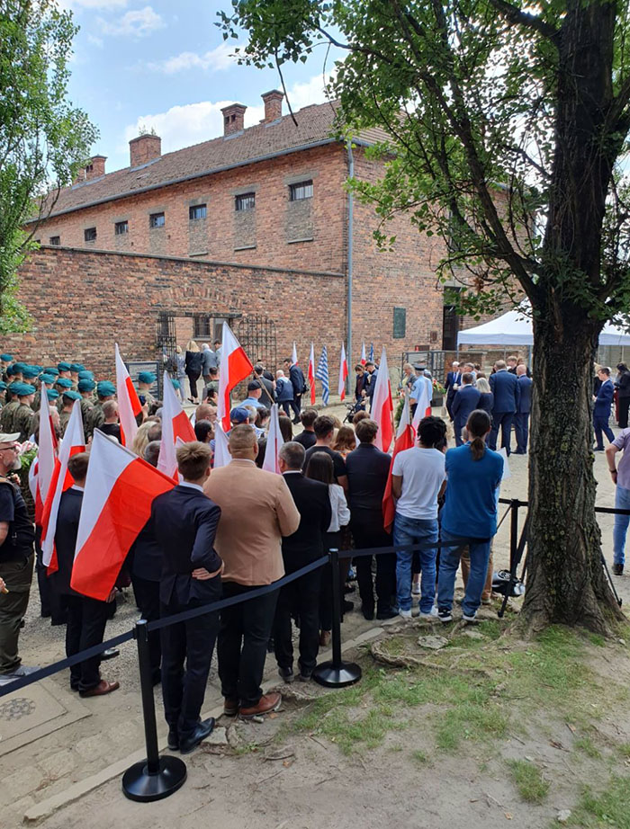 Pod Szkołą rtm. Pileckiego wspominamy 728 wieźniów tarnowskiego transportu, którzy w budynku ówczesnego Monopolu Tytoniowego odbyli dwutygodniową kwarantannę przed przeniesieniem do właściwego obozu. Przemówienia i złożenie kwiatów i już trzeba pędzić do właściwego obozu. Wpuszczają nas od strony wartowni i po kontroli wykrywaczami metali przez bramę z napisem ARBEIT MACHT FREI docieramy po kilku minutach marszu na miejsce głównego upamiętnienia czyli pod Ścianę Śmierci w obozie Auschwitz 1 gdzie już rozpoczęto przemowy. Uczestników dość dużo, ale mogłoby być znacznie więcej bo przecież jest dużo miejsca – być może część chętnych rezygnuje z uwagi na to, że trzeba się wcześniej starać o karty wstępu, a na dodatek nie wiadomo czy się je otrzyma. Mojemu znajomemu z Warszawy w przeddzień uroczystości cofnięto akredytację nie podając żadnej przyczyny tej decyzji /sic!/.