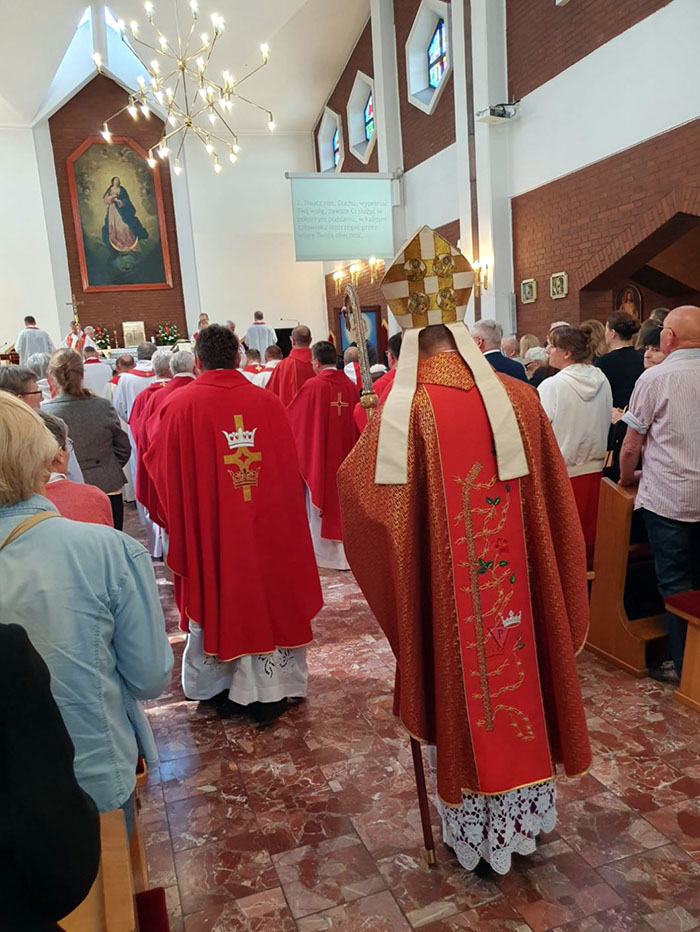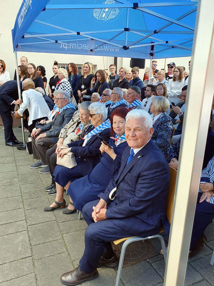 Uroczysta msza św. celebrowana była przez ordynariusza miejsca biskupa R.Pindla wraz z kilkunastona koncelebransami. Wsród uczestników znajdowało się kilku świadków historii – więźniów Auschwitz. Wśród nich spotkaliśmy niezwykłe małżeństwo Państwa Werników – Pani Stefania dziecko urodzone w KL Auschwitz nr obozowy 89136, a Pan Jan cudownie przeżył masakry na Wołyniu. Cieszą się znakomitym zdrowiem i są pełni radości życia. Oczywiście wykonaliśmy pamiątkowe zdjęcie.