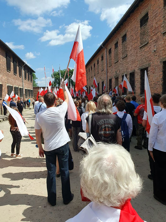 To prawie 60-osobowa delegacja wrocławskiego Klubu Gazety Polskiej, a w niej wielu naszych znajomych. I tak spotykaliśmy się z nimi cały dzień w przelocie z jednej części uroczystości na kolejne punkty programu. Podobnie jak i my wieźli ze sobą pokaźny wieniec kwiatów do złożenia pod Ścianą Śmierci w hołdzie dla ponad 7,5 tys. Polaków zamordowanych właśnie w tym miejscu często z okrzykiem “jeszcze Polska nie zginęła”.