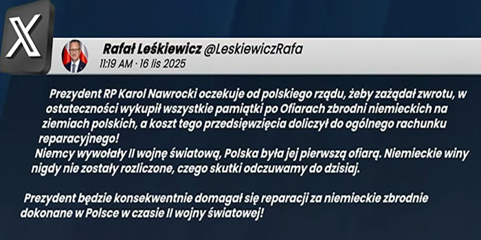 Ta buta i arogancja wobec nas szczególnie widoczna jest przy analizie rozliczeń za zbrodnie wojenne na wschodzie Europy, ale coraz bardziej widoczna jest również w różnych działaniach gospodarczych ograniczających nasze zdolności rozwojowe choćby zamrożenie żeglugi i transportu na Odrze, przejmowanie portów, likwidowanie kopalń itd. czy zagrożeń politycznych.