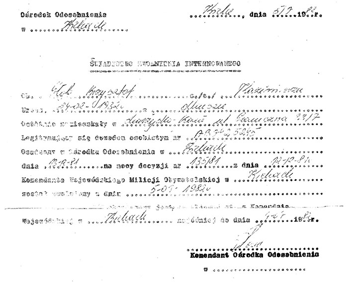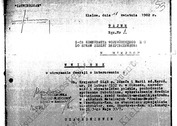 Krzysztof Głąb:   Byłem internowany do 8-10 lipca 1982. Ogólnie spędziłem w więzieniu 7 miesięcy.