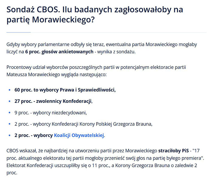 Badania CBOS mówią nam coś jeszcze, tym razem niejako w charakterze przestrogi. CBOS wskazał, że najbardziej na utworzeniu partii przez Morawieckiego straciłoby PiS – “17 proc. aktualnego elektoratu tej partii mogłoby przenieść swój głos na partię byłego premiera“.