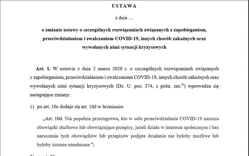 “Nie popełnia przestępstwa, kto w celu przeciwdziałania COVID-19 narusza obowiązki służbowe lub obowiązujące przepisy, jeżeli działa w interesie społecznym”