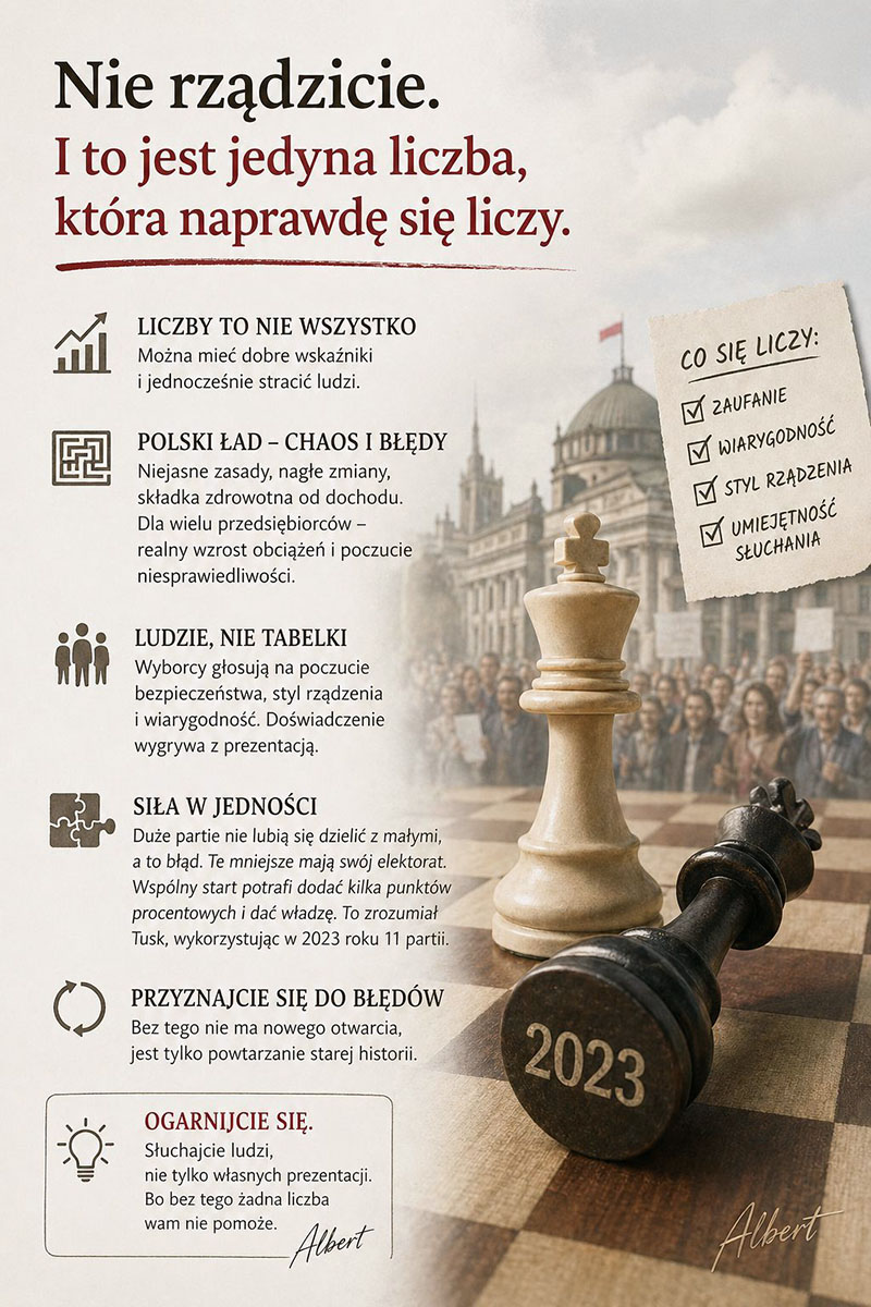 Najprostsze pytanie brzmi: skoro było tak dobrze, to dlaczego przegraliście? Jeśli bilans był dodatni, to gdzie wyparowało zaufanie? Wyborcy nie głosują na tabelki. Głosują na poczucie bezpieczeństwa, styl rządzenia i wiarygodność. Można mieć przyzwoite wskaźniki i jednocześnie stracić ludzi.