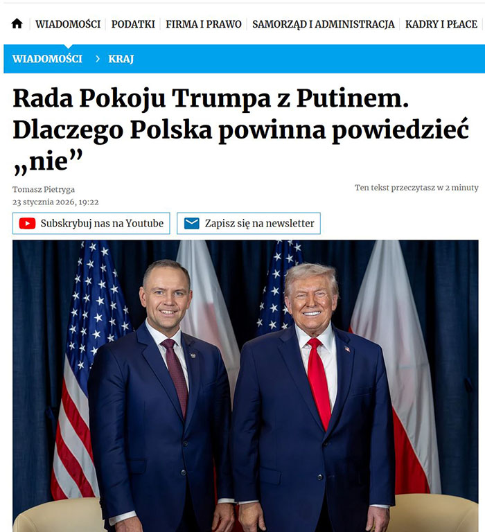 W debacie o włączeniu Polski do Rady Pokoju, jedynym śmiałkiem który jednoznacznie zabrał głos w temacie jest Tomasz Pietryga, redaktor naczelny Dziennika Gazety Prawnej stwierdzając:“Prezydent Karol Nawrocki nie powinien zasiadać w Radzie Pokoju z Putinem i Łukaszenką. Odrzucenie propozycji Donalda Trumpa nie przekreśla dobrych relacji z USA i nie będzie aktem nielojalności wobec sojusznika, bo interesy suwerennych państw nie zawsze muszą być zbieżne. W interesie Polski nie leży wpuszczanie dyktatorów na salony ani geopolityczny powrót do przeszłości”.Redaktorowi naczelnemu chwała za jednoznaczność wypowiedzi i wynikające z tego konsekwencje. Poczytny Dziennik Gazeta Prawna nie stracił na poczytności – wypowiedź Tomasza Pietrygi ukazała się na portalu gazety 23 stycznia. Nie słychać słów rezygnacji Pietrygi ale co symptomatyczne, nie słychać także komentarzy na temat jego wypowiedzi ze strony prominentnych publicystów o których wspomniałem wcześniej. Znamienne – można mieć w kraju niepopularne zdanie i nie stracić posady