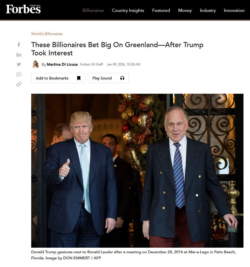 Ci miliarderzy postawili na Grenlandię ogromne pieniądze – po tym, jak zainteresował się nią Trump. Forbes, 9 stycznia 2026.