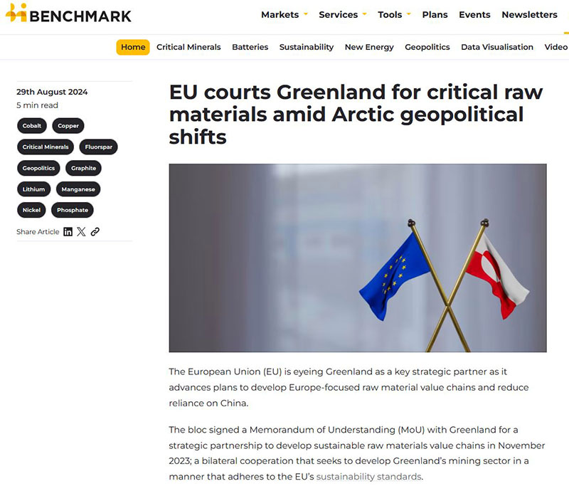 "W obliczu zmian geopolitycznych w Arktyce, Unia Europejska zabiega o dostęp do kluczowych surowców na Grenlandii". Nagłówek tekstu z portalu Benchmark- 29 sierpnia 2024.