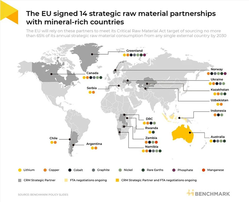 W listopadzie 2023 roku Unia podpisała z Grenlandią memorandum o porozumieniu w sprawie strategicznego partnerstwa na rzecz rozwoju zrównoważonych łańcuchów wartości surowców; dwustronna współpraca ma na celu rozwój grenlandzkiego sektora wydobywczego zgodnie ze standardami zrównoważonego rozwoju Unii Europejskiej. Nagłówki gazet nie kłamią: Unia Europejska podpisała 14 strategicznych porozumień w sprawie surowców z krajami bogatymi w minerały, w tym z.. Grenlandią.